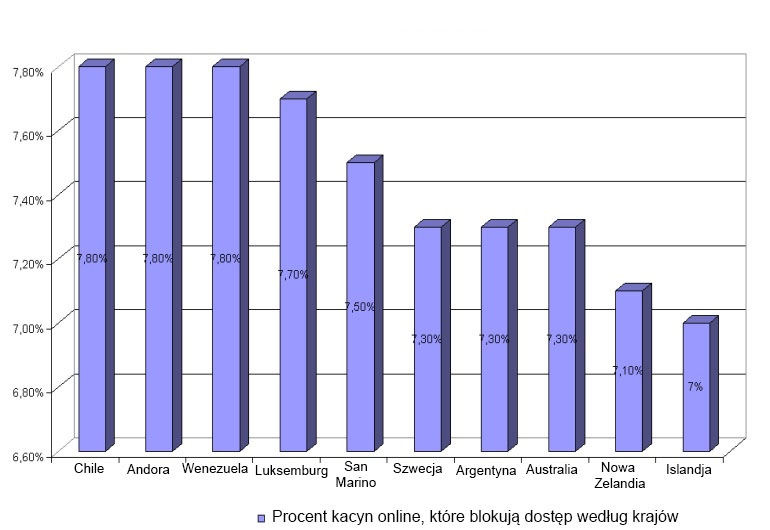 Na następnym wykresie listy znajdują się kraje, w których obywatele mają mniej problemów z dostępem do stron internetowych zagranicznych operatorów gier hazardowych. Tylko 7% zakładów hazardowych blokuje dostęp do swoich witryn obywatelom z Islandii. Mieszkańcy Nowej Zelandii, Austrii, Australii, Argentyny i Szwecji bez żadnych problemów wchodzą na strony większości zagranicznych kasyn online.