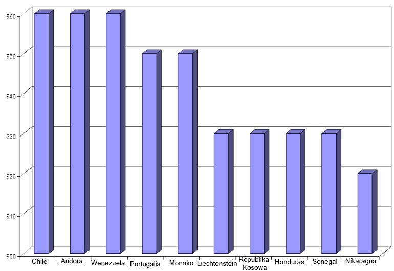 Najlepsze wyniki wykazały takie kraje – Chile, Andora i Wenezuela. Zdobyli ponad 960 punktów na 1,000.