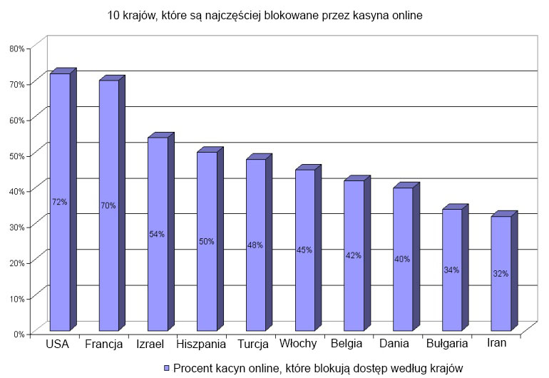 Teraz powstaje pytanie, które kraje najczęściej należą do “czarnej listy” zakładów hazardowych? Najczęściej kasyna online odmawiają graczom ze Stanów Zjednoczonych, a następnie Francji i Izraelu. Czyli około 72% wszystkich kasyn online na świecie ograniczają dostęp do swoich witryn dla obywateli USA. Francuzi nie są mile widziani w 70% kasyn online, a Izraelczycy nie są mile widziani w 54%.